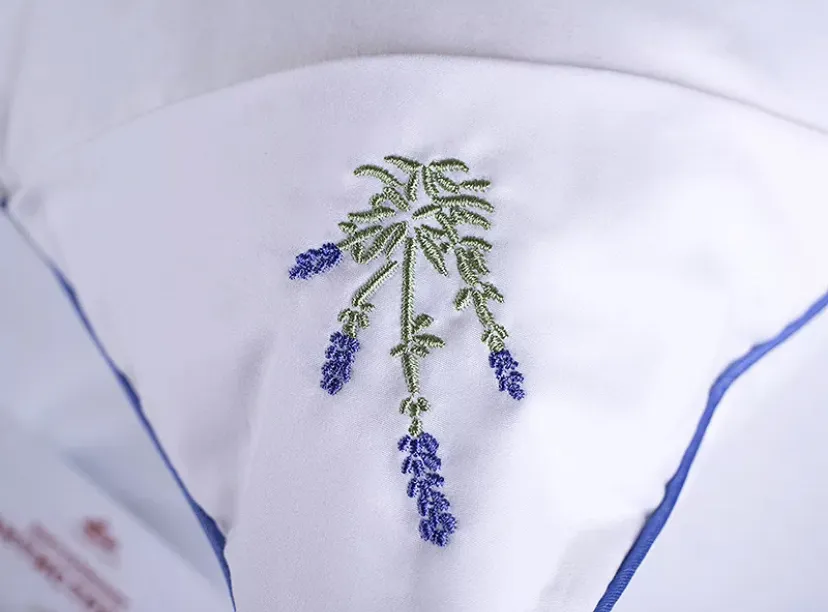 Технология пошива одеяла: Стежка на одноигольной машине по оригинальному цветочному рисунку, по периметру одеяла атласный кант. Дизайн одеяла дополнен удобным кармашком с оригинальной вышивкой, в который можно поместить саше, наполненное натуральными высушенными цветочками лаванды входящее в комплект этого изделия.