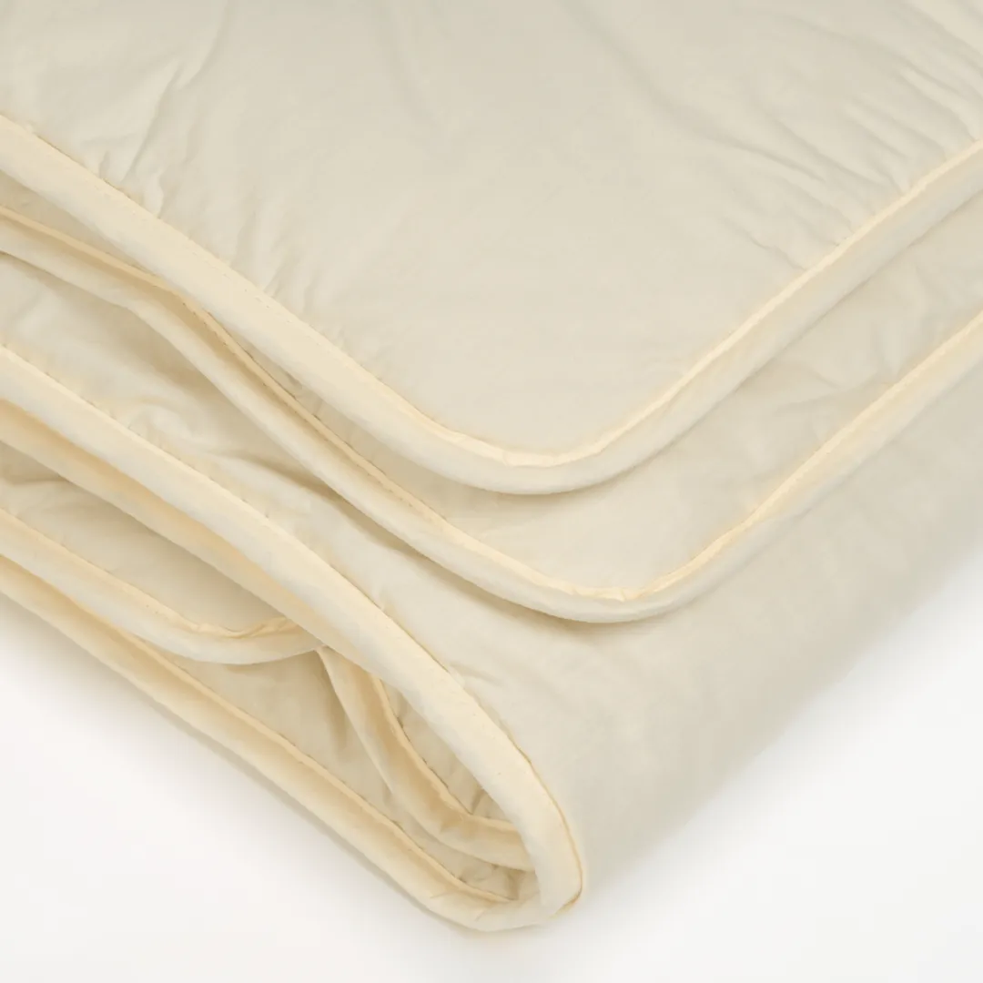Ткань чехла: 100% хлопок —мерсеризованный тик полотняного переплетения из длинноволокнистого хлопка, обеспечивающего отсутствие ворсистости и однородность ткани. Высокая плотность: 206/155 нитей на 10 см²,135 г/м². Цвет золотисто-бежевый. Подобного качества ткань технологически необходима для использования с верблюжьей шерстью.