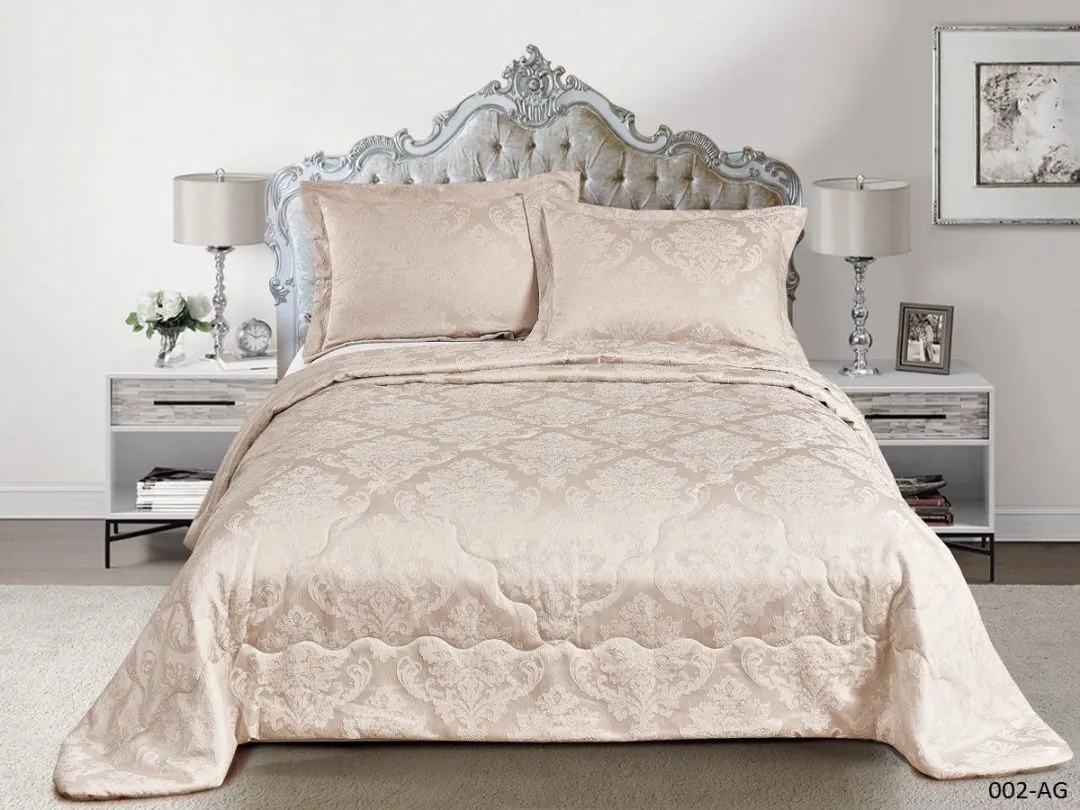 Комплект покрывала с наволочками "AGATA" выполнен в лучших традициях французского ткачества. Выбран благородный жаккардовый узор и нежные оттенки ткани. Рельефная текстура покрывала выглядит изысканно. Наволочки декорированы французским кантом. Плотность изделия 150гр/м2. Благодаря этому покрывало получилось мягкое и воздушное. Упаковка ПВХ чемодан.